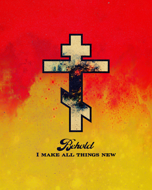 Behold, I Make All Things New (Rev 21:5) | Cosmic Orthodox Cross on Red and Yellow Background | Orthodox Christian Cotton T-Shirt
