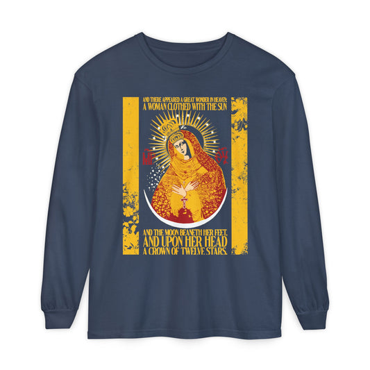 Our Lady the Gate of Dawn | Woman of the Apocalypse Rev 12:1 | Theotokos Gold Floral Texture Design | Orthodox Christian Cotton Long Sleeve