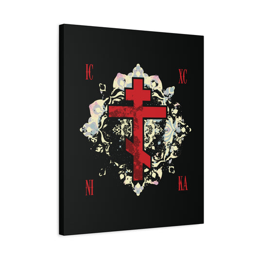 ICXC NIKA Means Jesus Christ Conquers | Textured Red Orthodox Cross w/ Medieval Floral Background | Orthodox Christian Canvas Art