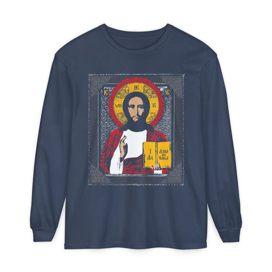 Christ Pantocrator Icono-Graphic | He-Who-Is | I Am the Alpha and Omega | Ancient Icon Graphic Design | Orthodox Long Sleeve Cotton Shirt