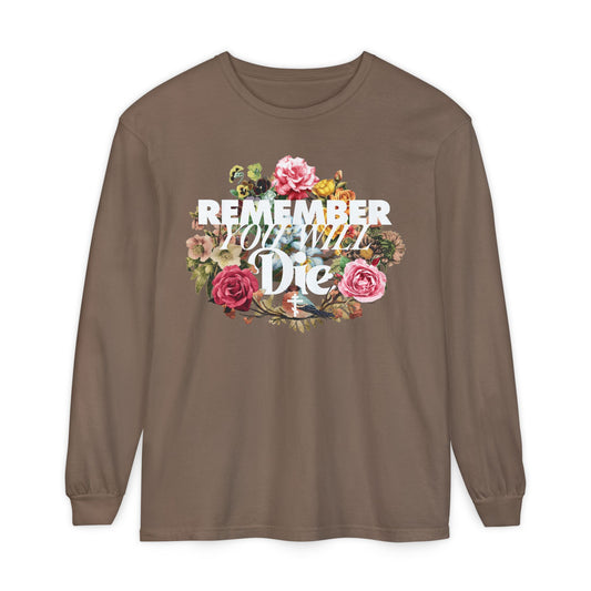Remember You Will Die | Cross | Classic Typography & Floral Wreath Design | Memento Mori | Orthodox Long Sleeve Cotton Shirt