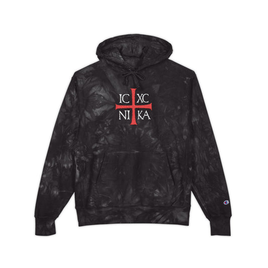 ICXC NIKA Means Jesus Christ Conquers | Embroidered Red Cross White Text | Tie-Dye Heavy Hoodie | Orthodox Christian Premium Streetwear