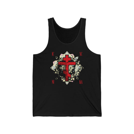 ICXC NIKA Means Jesus Christ Conquers | Textured Red Orthodox Cross w/ Medieval Floral Background | Orthodox Christian Tank Top