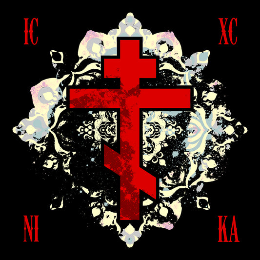 Adoration of Holy Cross IconoGraphic | Striking Red, White, & Black Russian Cross Design w/ Angels | Canvas IconoGraphic | Orthodox Christian Art