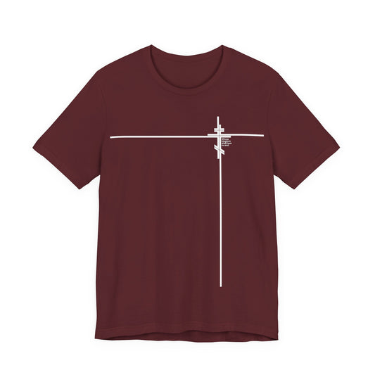 White on Light Small Embroidered Orthodox Cross | May I Never Boast Except in the Cross (Gal 6:14) | Christian Cotton Unisex T-Shirt
