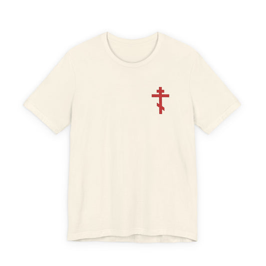 Small Red Embroidered Orthodox Cross | May I Never Boast Except in the Cross (Gal 6:14) | Christian Cotton Unisex T-Shirt