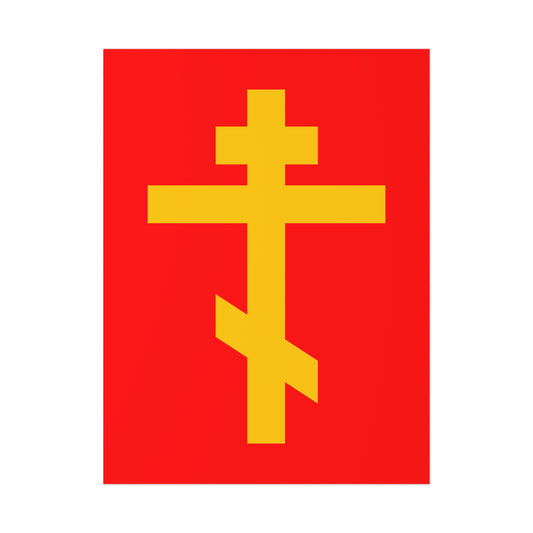 Yellow Orthodox Cross Red Background | Precious and Life-Giving Weapon of Unseen Warfare | Scourge of Demons | Orthodox Art Poster