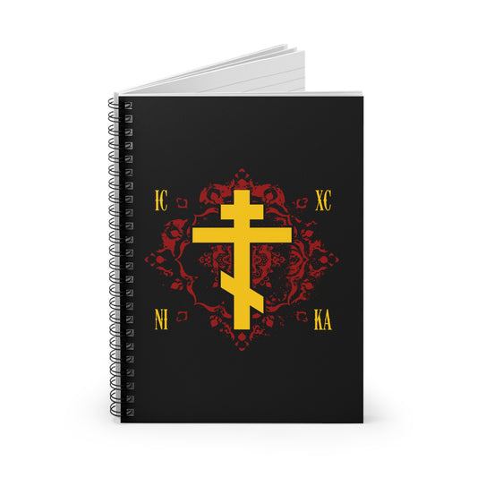 ICXC NIKA Yellow Russian Cross on Ornate Red Background Design | Jesus Christ Conquers | Christian Spiral Notebook