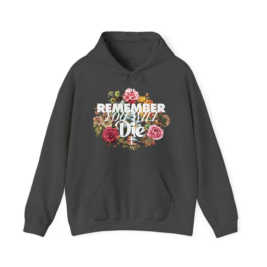 Remember You Will Die | Cross | Classic Typography & Floral Wreath Design (FRONT PRINT) | Memento Mori | Orthodox Christian Hoodie