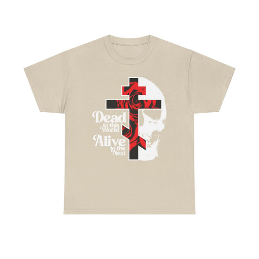 Dead to this World | Christian Goth Flower Cross & Skull | 70s Typography | Bestselling Design | Orthodox Christian Heavy Cotton T-Shirt