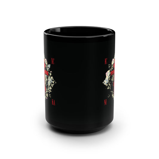 ICXC NIKA Means Jesus Christ Conquers | Textured Red Orthodox Cross w/ Medieval Floral Background | Orthodox Christian Black Mug