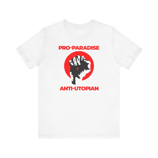 Pro-Paradise Anti-Utopian | Jesus Christ Crucified NIKA Fist | Resist the Dominant Secular Paradigm | Orthodox Christian Cotton T-Shirt
