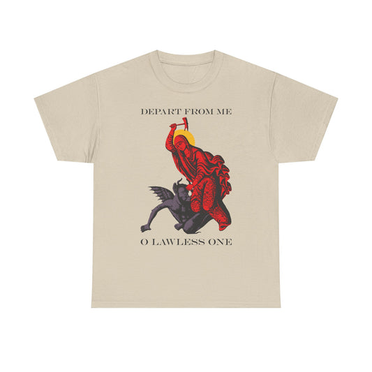 St Marina IconoGraphic (Depart from Me O Lawless One) | Saint Beating the Devil with a Hammer | Orthodox Christian Heavy Cotton T-Shirt