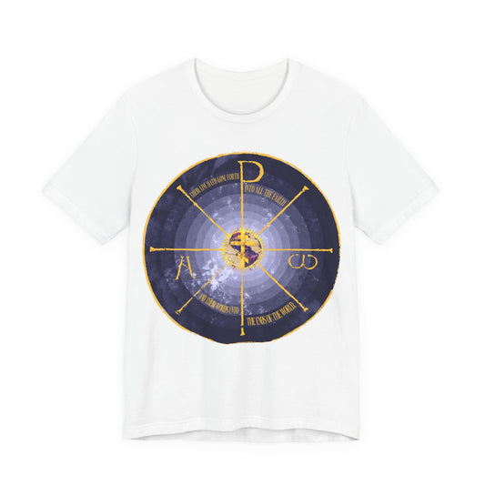 Geocentric Cross & Chi Rho | Alpha & Omega | Blue and Yellow Design | Medieval Style Graphic | Orthodox Christian Cotton T-Shirt