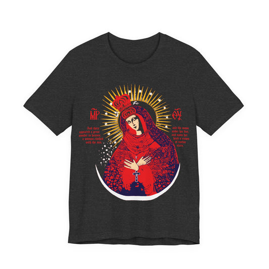 Our Lady the Gate of Dawn Icono-Graphic | Theotokos Crowned | Woman of the Apocalypse | Red Blue & Gold Design | Orthodox Cotton T-Shirt