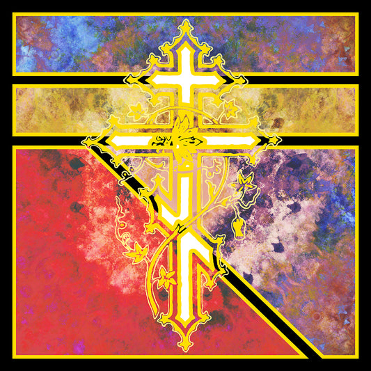 Golden Ornate Three-Bar Cross on Colorful Textured Geometric Pattern | Orthodox Christian T-Shirt