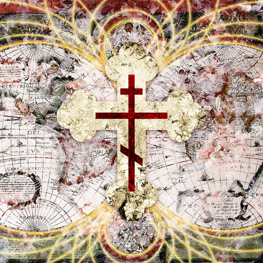Red Three-Bar Cross Design with Magnetic Lines Over Textured World Map | Orthodox Christian T-Shirt