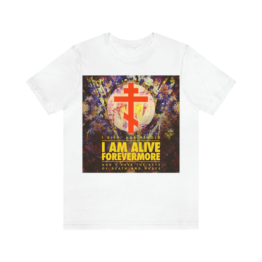 I died & behold I am alive forevermore, and I have the keys of Death and Hades (Revelation 1:18) | Red Cross on Textured Background | Orthodox Christian T-Shirt