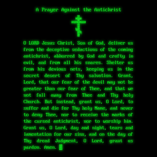 Prayer Against the Antichrist by Elder Anatoly the Younger of Optina Pustyn Monastery | Retro Computer Screen Pixel Text | Orthodox Christian T-Shirt