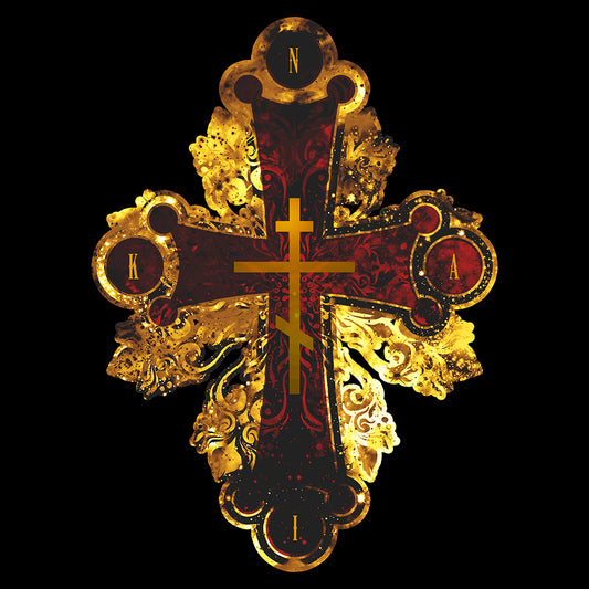 ICXC NIKA Artistic Textured Red & Gold Russian Cross | Orthodox Christian T-Shirt