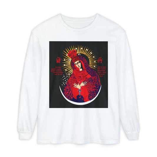 Our Lady the Gate of Dawn Icono-Graphic | Theotokos Crowned | Woman of the Apocalypse | Red Blue & Gold Design | Orthodox Long Sleeve Cotton Shirt