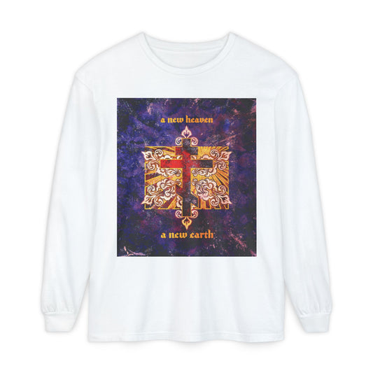 A New Heaven/A New Earth | Red Orthodox Cross on Textured Ornate Background | Red Blue & Gold Design | Orthodox Long Sleeve Cotton Shirt