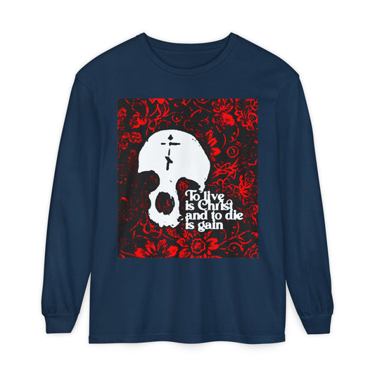 To Live is Christ To Die is Gain (Phil 1:21) | Skull with Cross on Red Floral Texture | Orthodox Christian Long Sleeve Shirt