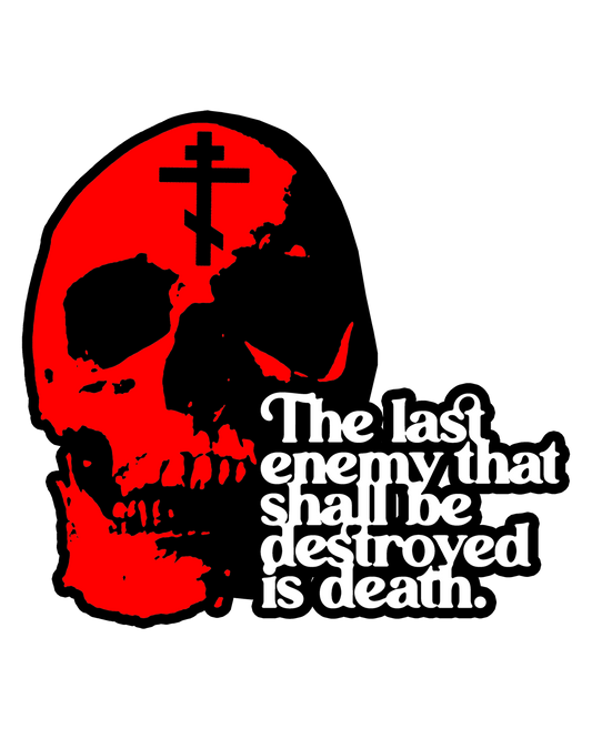 The Last Enemy That Shall Be Destroyed (1 Corinthians 15:26) | Red Skull on Yellow Background | Orthodox Christian Blue Denim Jacket