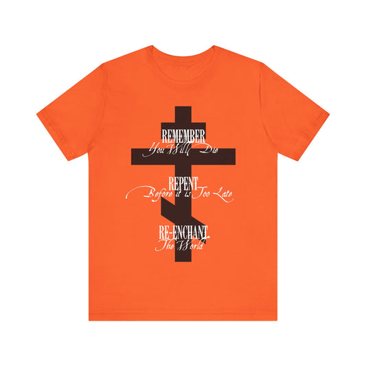 Remember You Will Die, Repent Before It's Too Late, Re-Enchant The World | Black Orthodox Cross White Text | Orthodox Christian Cotton T-Shirt