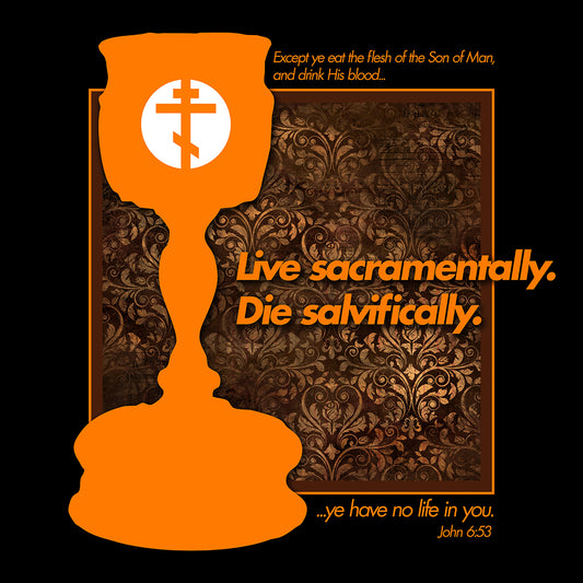 Live Sacramentally, Die Salvifically | Orange Communion Chalice on Textured Background | Orthodox Christian T-Shirt