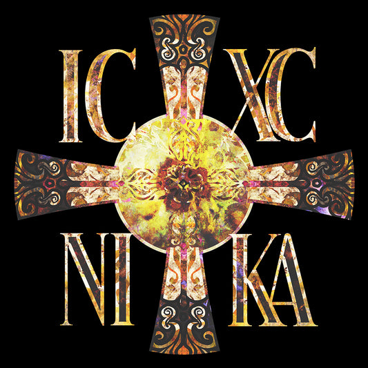 ICXC NIKA Celtic Style Equal Armed Cross | Bright Solar Texture | Orthodox Christian T-Shirt