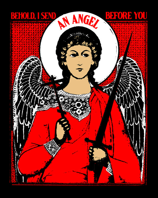 Behold I Send an Angel Before You (Ex 23:20) | Guardian Angel With Cross & Sword IconoGraphic | Orthodox Christian Cotton T-Shirt