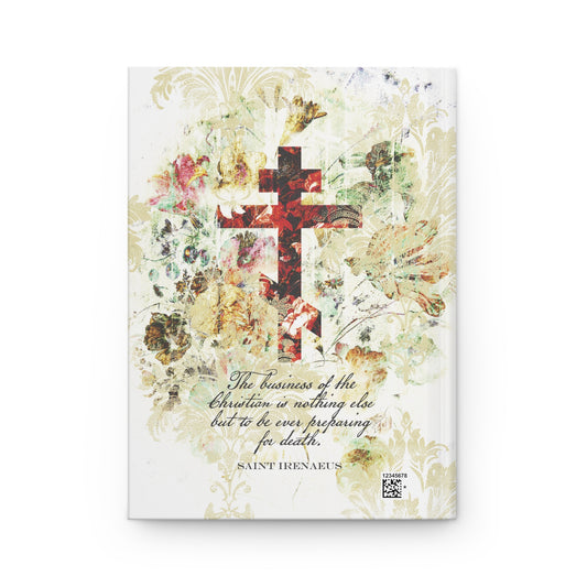 Preparing For Death | White & Beige Floral Scrapbook Texture Cross | Arts & Crafts Style | St Irenaeus | Orthodox Christian Hardcover Journal