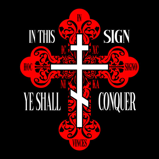 In This Sign Ye Shall Conquer | In Hoc Signo Vinces | ICXC NIKA | Red Ornate Orthodox Cross | Jesus Christ Conquers | Christian Hoodie