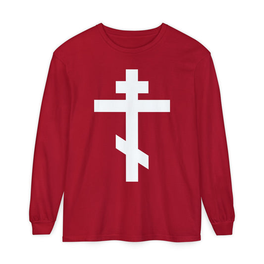 White Orthodox Cross | "May I never boast, except in the cross of our Lord Jesus Christ" (Gal 6:14) | Orthodox Long Sleeve Shirt