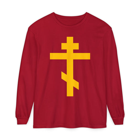 Yellow Orthodox Cross | Precious and Life-Giving Weapon of Unseen Warfare | Scourge of Demons | Christian Cotton Long Sleeve Shirt