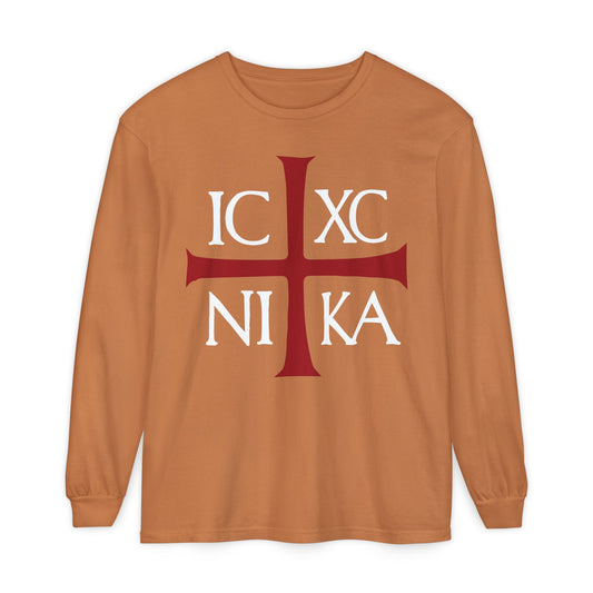 ICXC NIKA Means Jesus Christ Conquers | Red Cross White Text | Ancient Byzantine Christogram | Orthodox Christian Cotton Long Sleeve