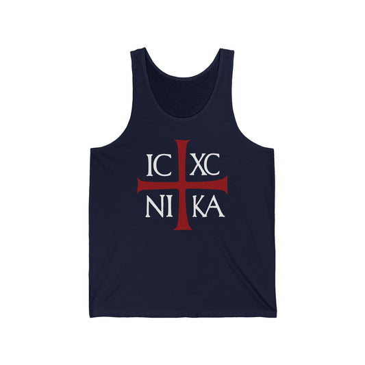 ICXC NIKA Means Jesus Christ Conquers | Red Cross White Text | Ancient Byzantine Christogram | Orthodox Christian Cotton Tank Top