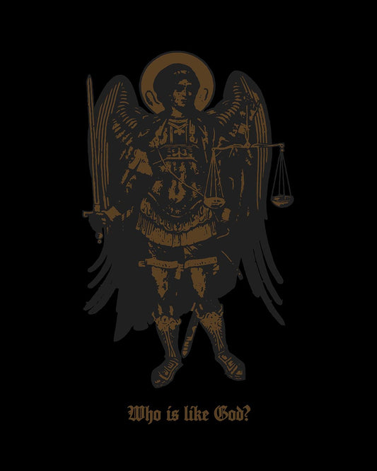 Black & Bronze Archangel Michael With Sword & Scales of Justice Icono-Graphic | Who Is Like God? | Orthodox Christian Cotton T-Shirt