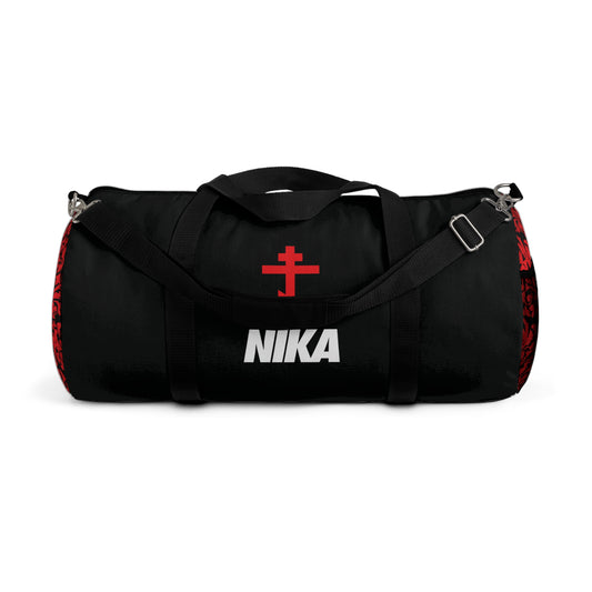 NIKA Red Orthodox Cross | Black Bag | NIKE Logo Mashup | Minimalist Corporate Sports Logo Aesthetic | Orthodox Christian Gym Duffel Bag