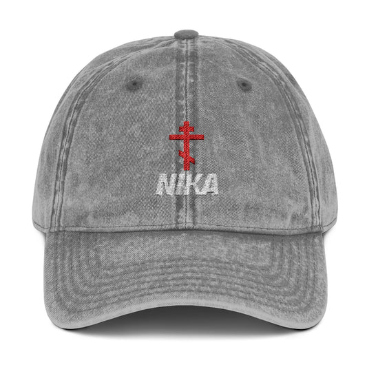 NIKA Red Russian Cross w/ White Text | NIKE Logo Mashup | Sports Logo Aesthetic | Orthodox Christian Distressed Embroidered Cap