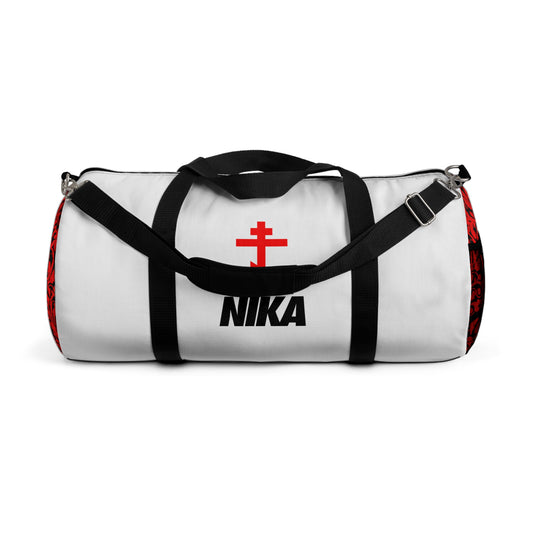 NIKA Red Orthodox Cross | White Bag | NIKE Logo Mashup | Minimalist Corporate Sports Logo Aesthetic | Orthodox Christian Gym Duffel Bag