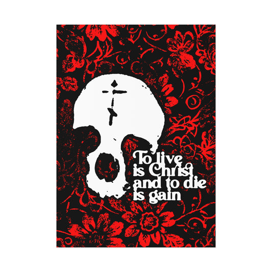 To Live is Christ To Die is Gain (Phil 1:21) | Skull with Cross on Red Floral Texture | Orthodox Christian Art Poster