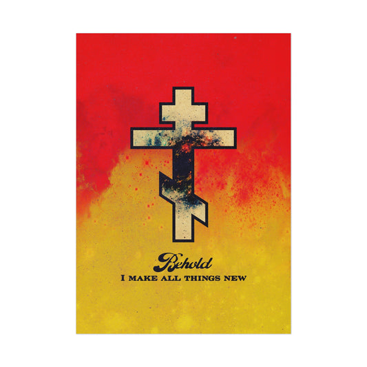 Behold, I Make All Things New (Rev 21:5) | Cosmic Orthodox Cross on Red and Yellow Background | Orthodox Christian Art Poster