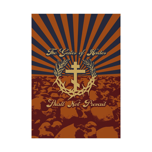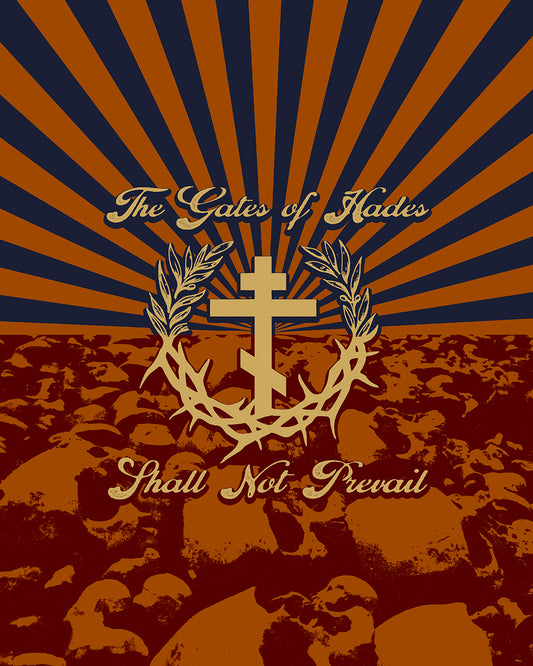 The Gates of Hades Shall Not Prevail | Cross with Wreath & Crown of Thorns | Skulls and Rays | Orthodox Christian Art Poster