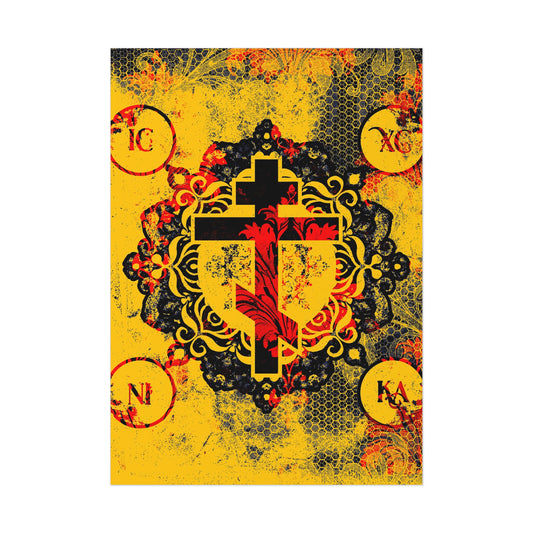 IC XC NIKA Orthodox Cross | Yellow & Red Modern & Medieval Textured Floral Design | Orthodox Christian Art Poster