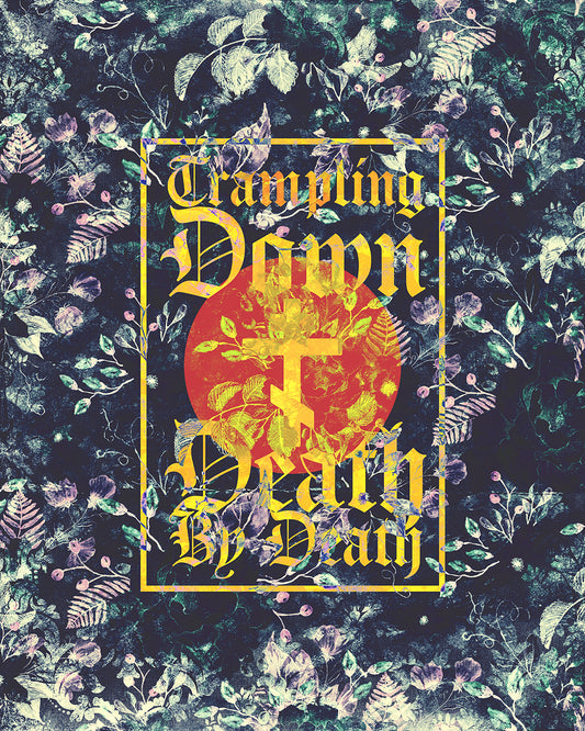 Trampling Down Death By Death | Paschal Floral Design with Gothic Script and Three-Bar Cross | Orthodox Christian Art Poster