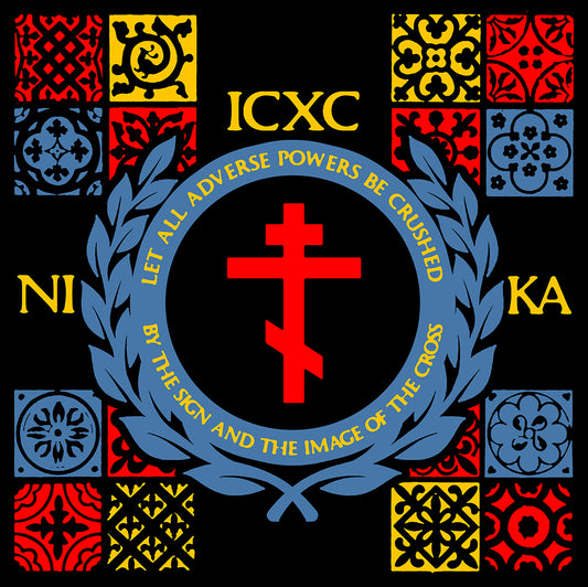 Let All Adverse Powers Be Crushed (Red, Yellow & Blue Design) | ICXC NIKA | Medieval Tile Design | Orthodox Christian Art Poster