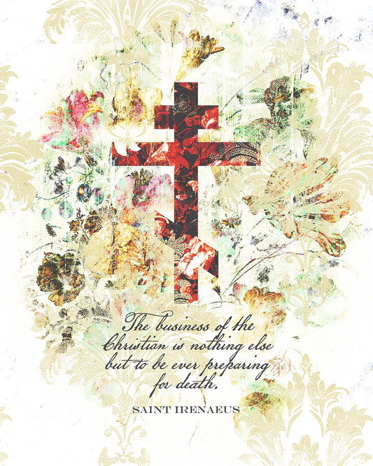 Preparing For Death | White & Beige Floral Scrapbook Texture Cross | Arts & Crafts Style | St Irenaeus | Orthodox Christian Art Poster