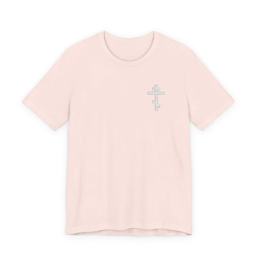 White on Light Small Embroidered Orthodox Cross | May I Never Boast Except in the Cross (Gal 6:14) | Christian Cotton Unisex T-Shirt